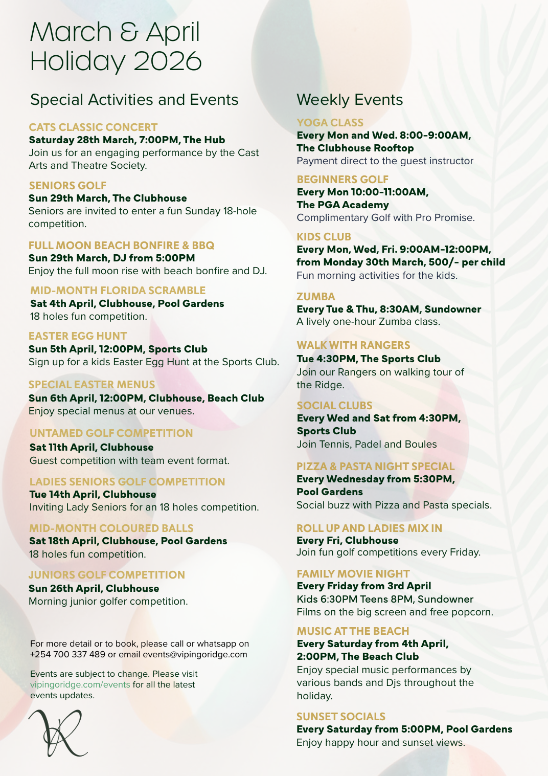Join us for special Easter activities, including the ever-popular Easter Egg Hunt, where children come together to celebrate the joy of Easter. Additional activities this year include the Family Cricket, Beginners Golf, Face Painting activities at the Beach Club, Live Music and all of the Vipingo Ridge activities. In parallel, adults can indulge in wine tasting, boules, leisurely brunches and much more.